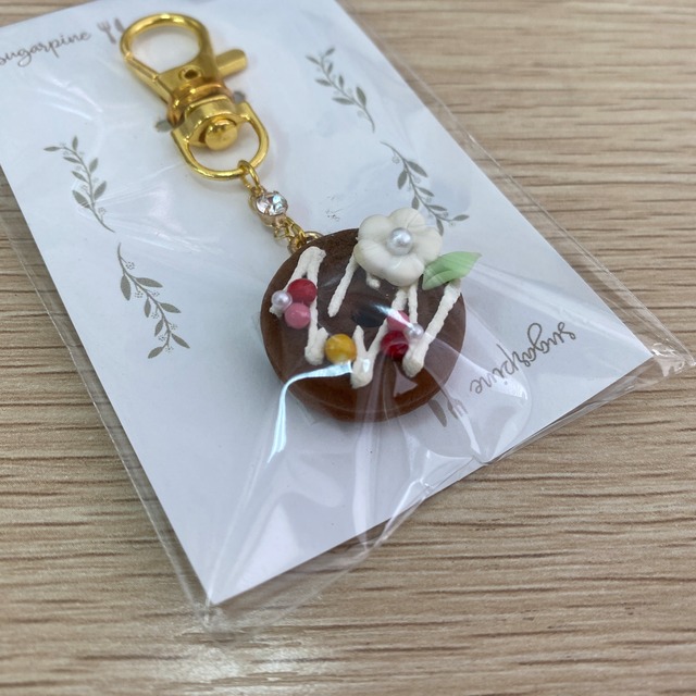 まるで本物のようなリアルなフードデコができました。 細部の質感にまでこだわり、ひとつひとつ樹脂粘土で手作りしています。 「ふっくらドーナツ チョコ」は、ふっくら揚げたチョコドーナツに、たっぷりのホワイトチョコをかけ、さらにお花型のチョコやミントをトッピングした、リアルなかわいさが魅力のフードデコです。 ナスカン金具と組み合わせ、キーホルダーとして仕上げました。 台紙にセットした状態でのお届けとなりますので、プチギフトにも最適です。 ※手作りのため、サイズや形に多少の誤差がありますことご了承ください。 ※金具の色は制作時期により写真と異なることがございます。 チャーム部分 約2cm パッケージサイズ 約6㎝×約9㎝