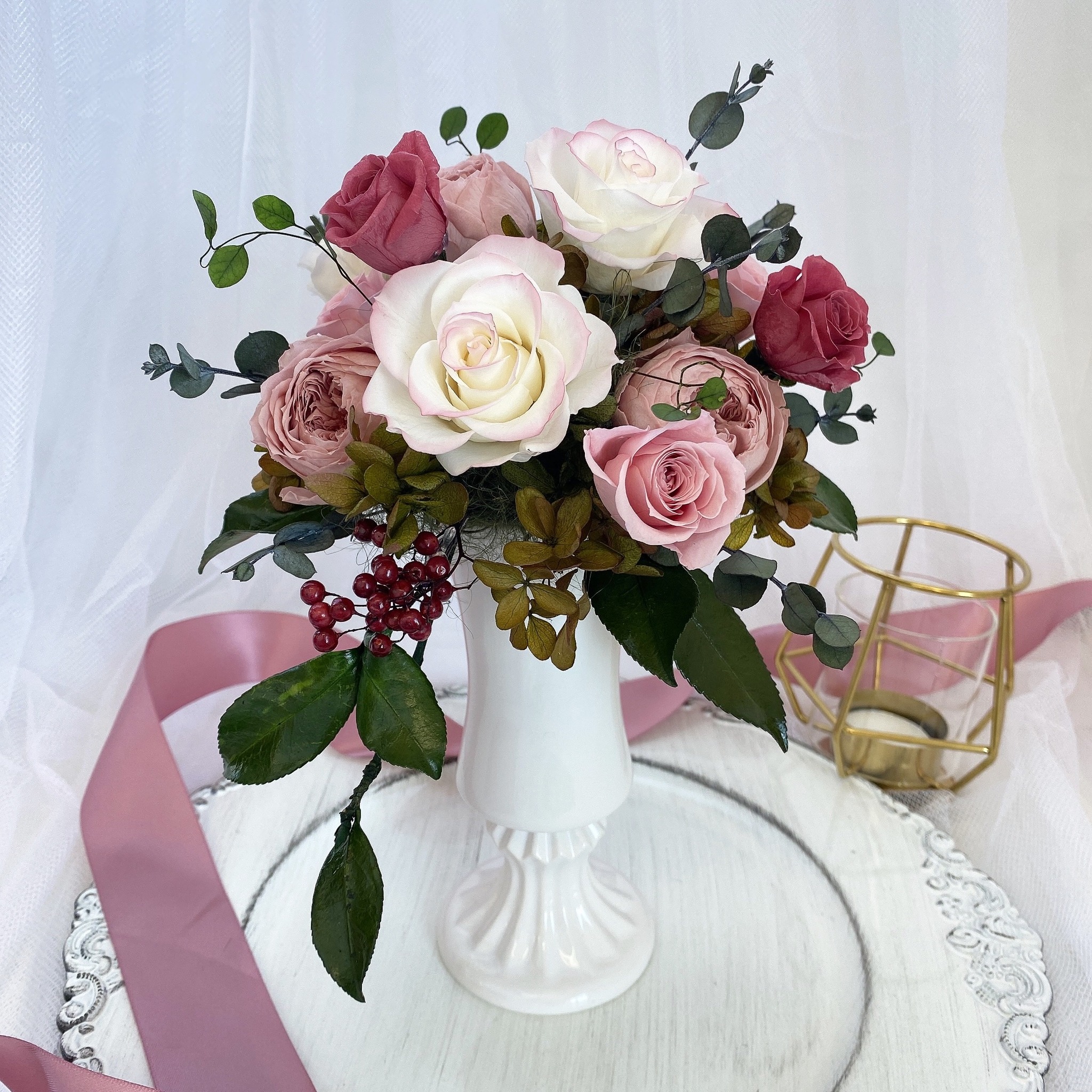 ペッパーベリーやユーカリの葉を組み合わせ、咲き誇るバラ園を表現しています。