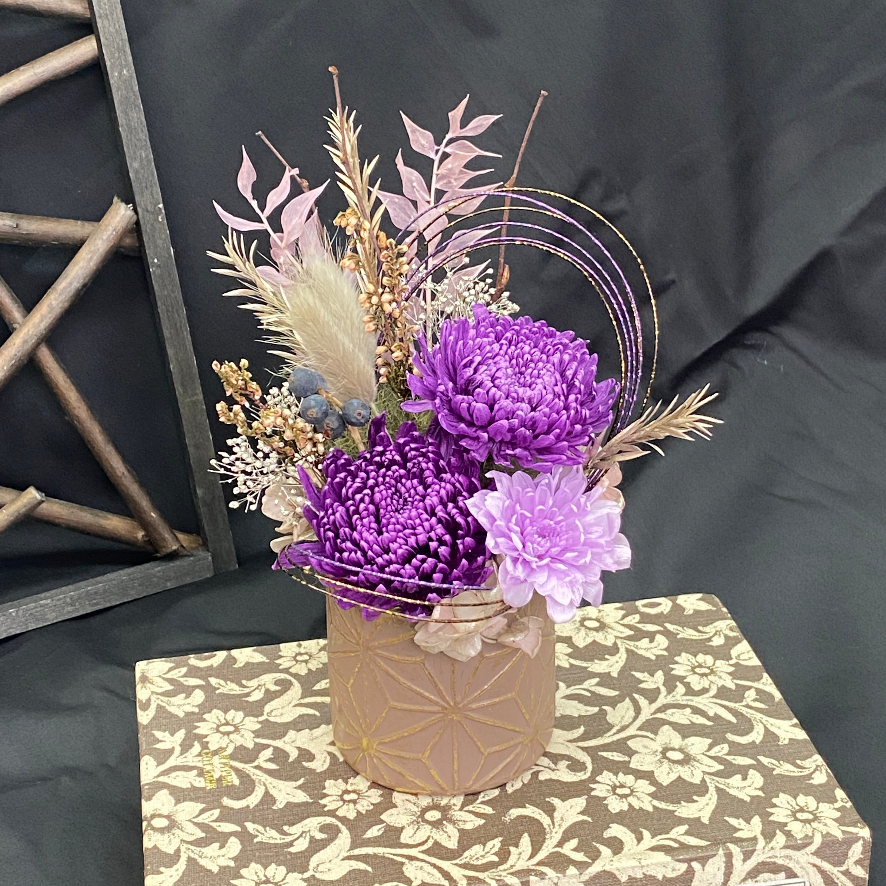 今季新色の大輪菊をメインにシックで上品な色合いの華やかな和モダンアレンジです。