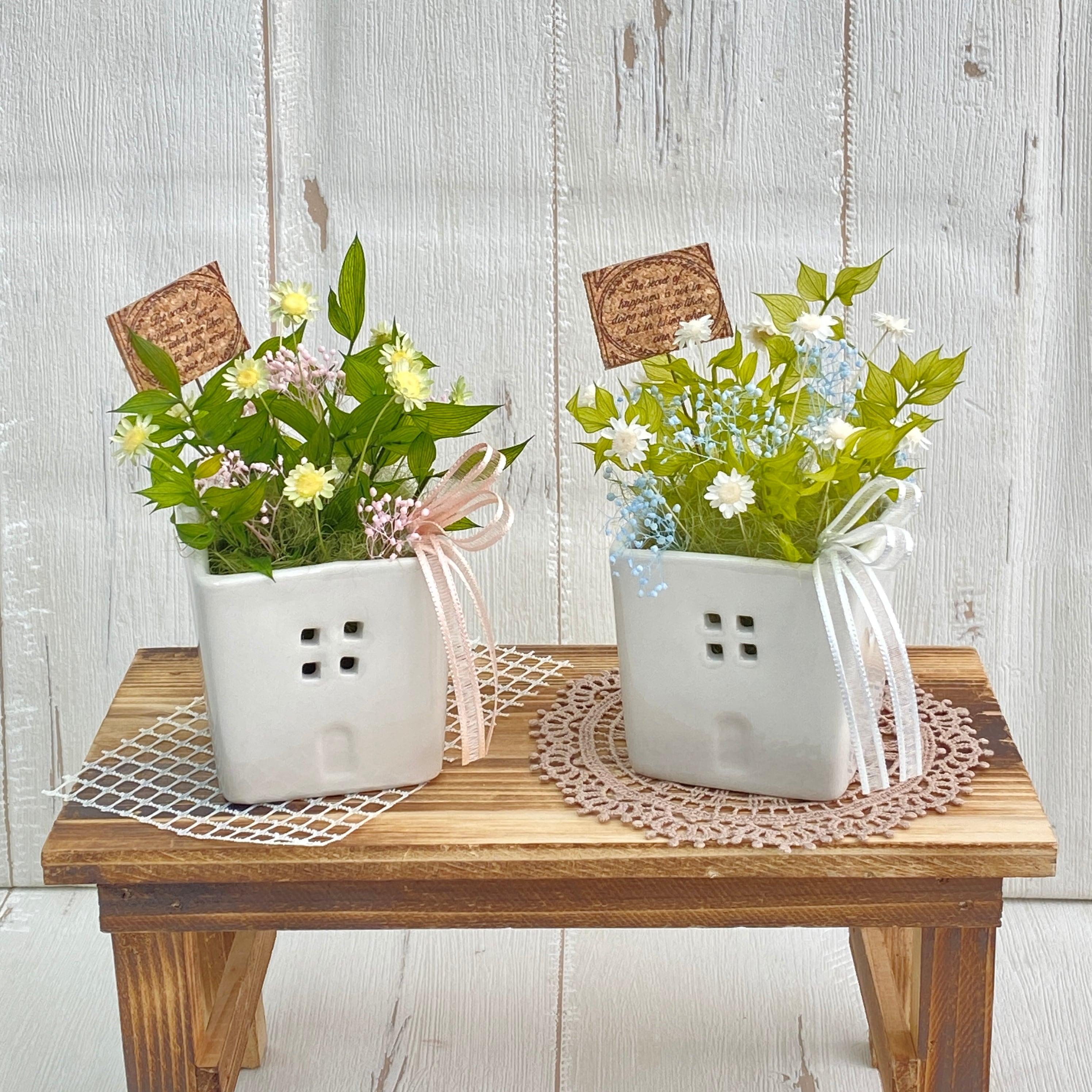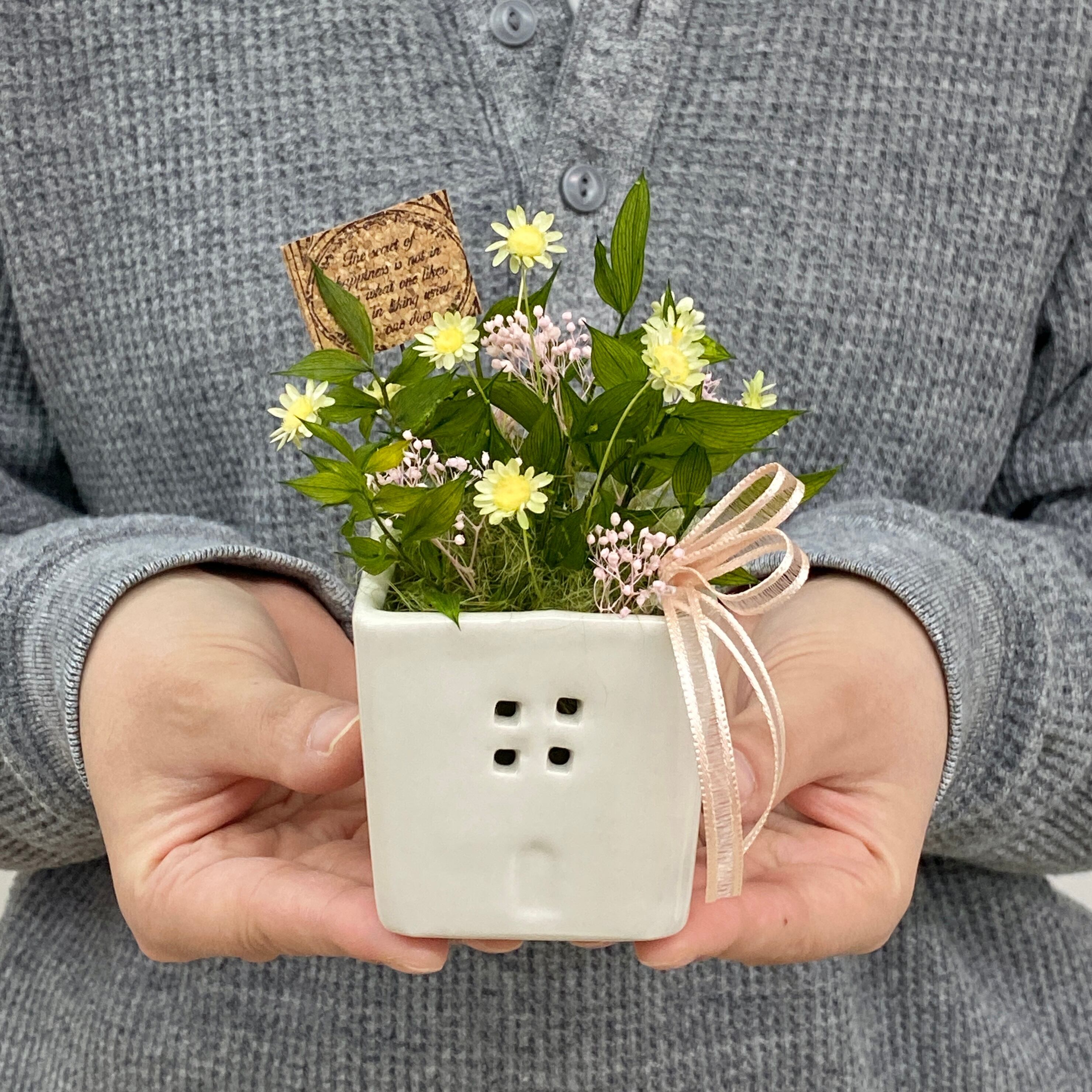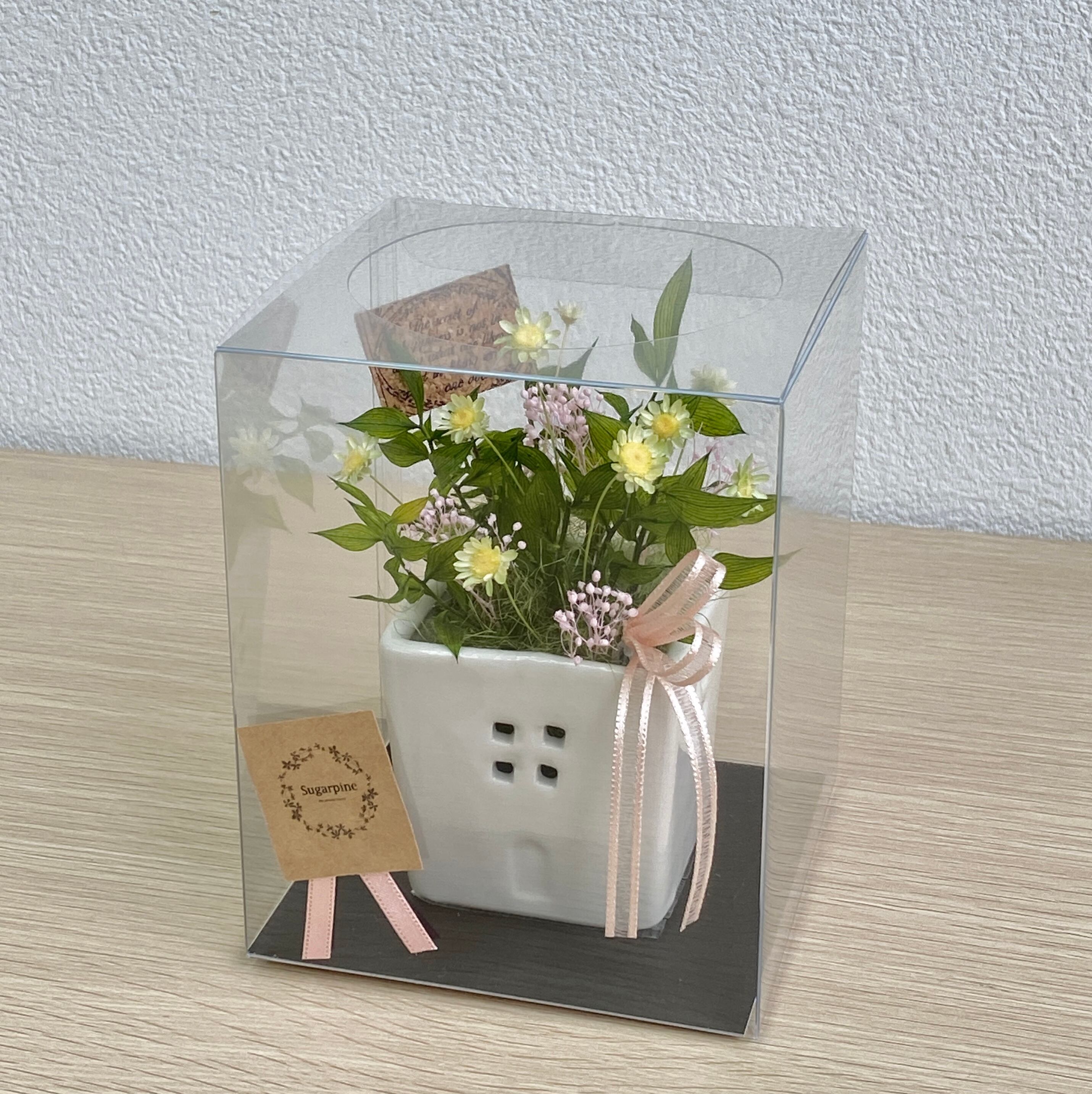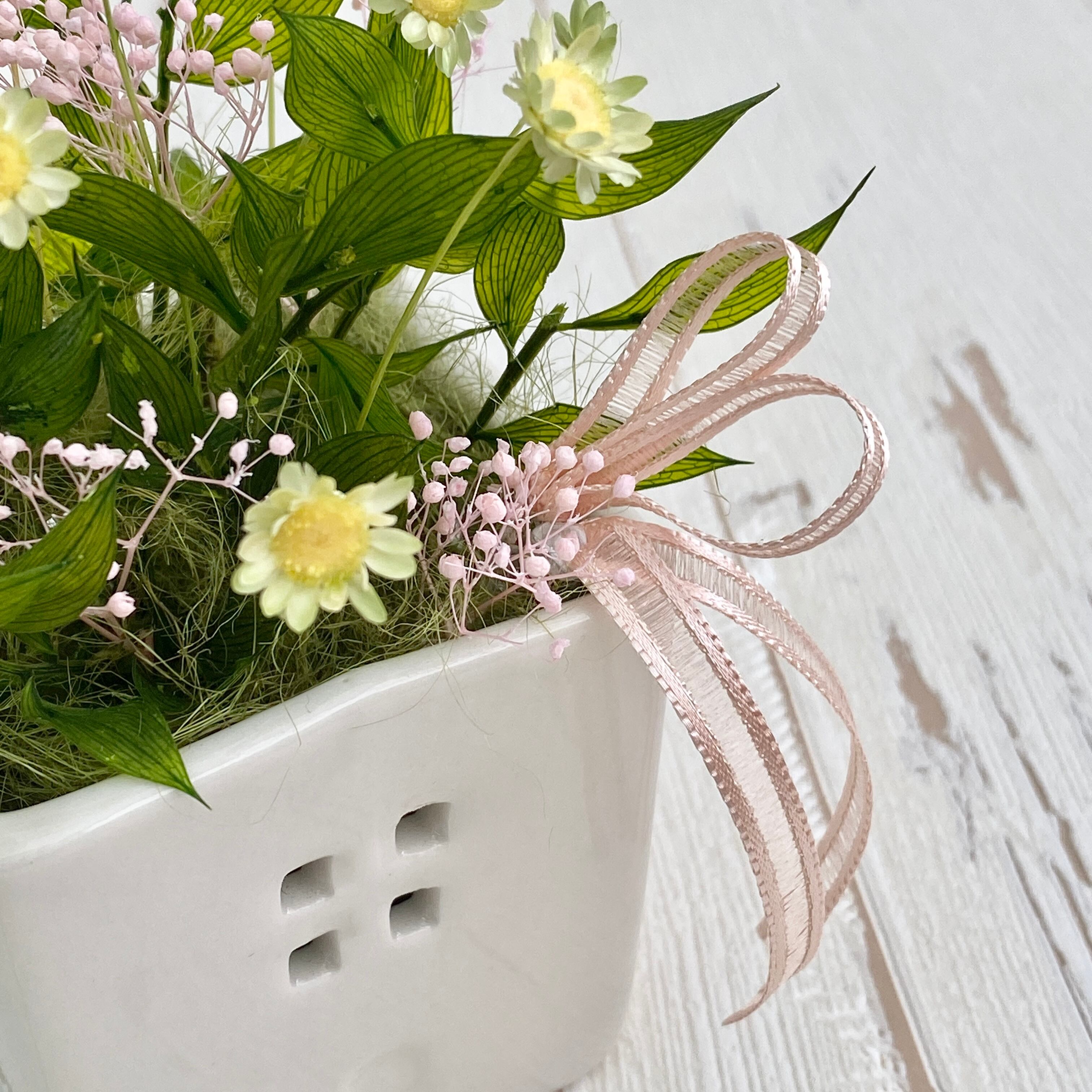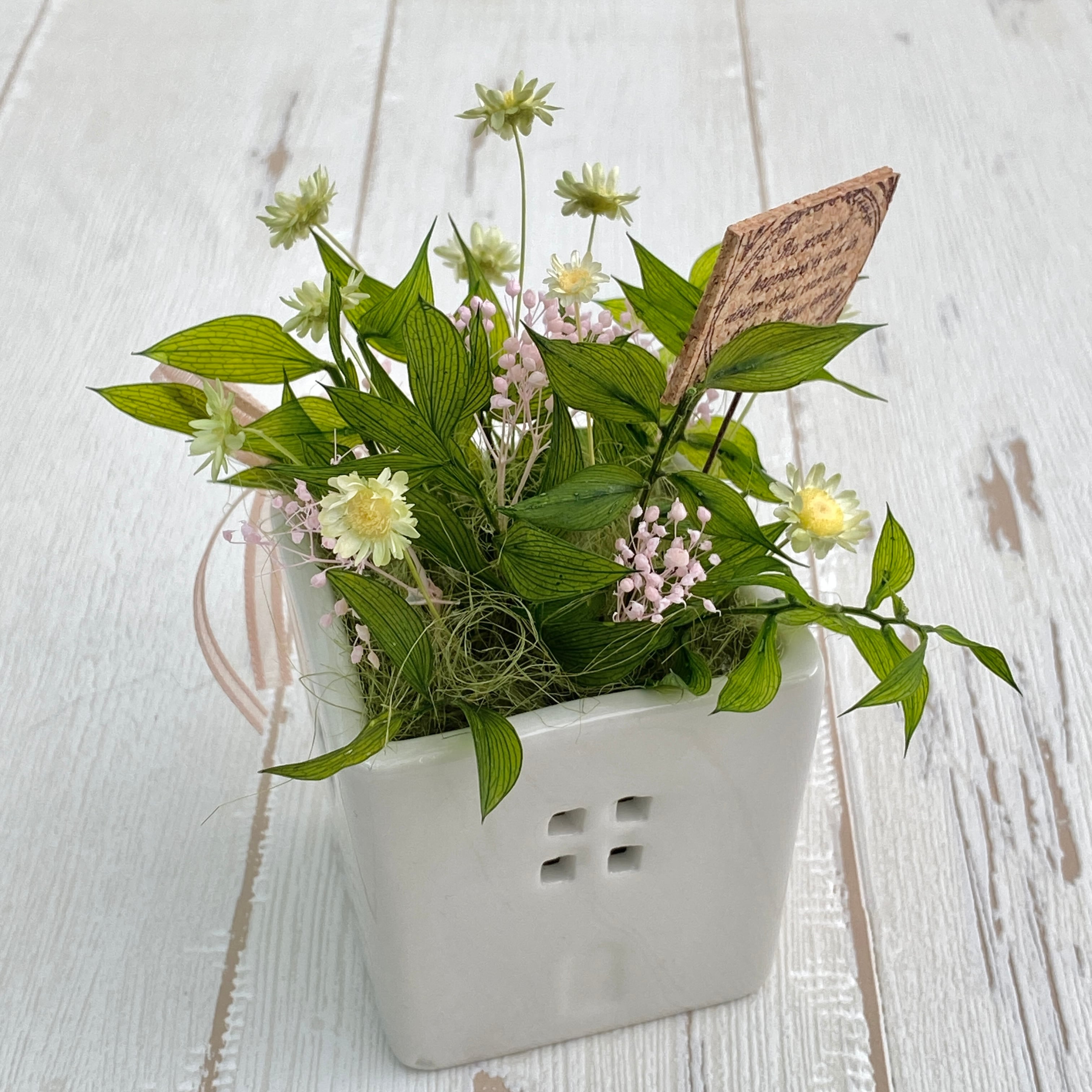 ハウス型のベースに瑞々しいグリーンと小花、高級リボンをあしらった、