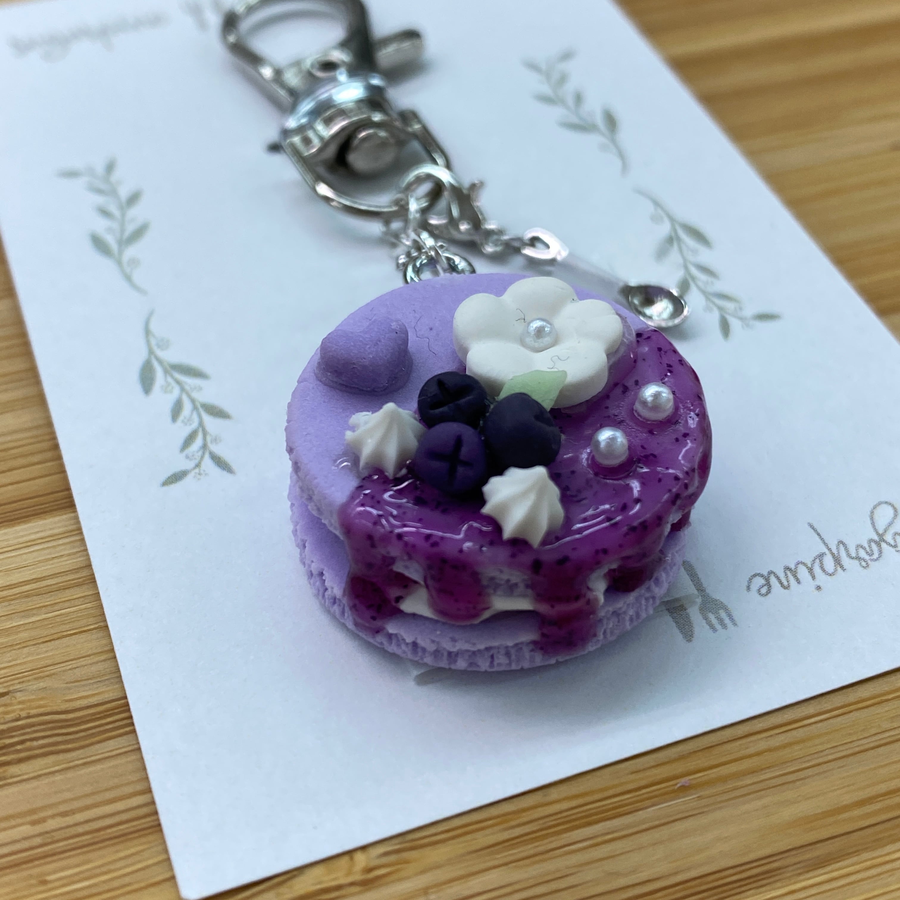 「マカロンケーキ べりー⁺チャーム」は、しっとり焼き上げたマカロンに、たっぷりのホイップをサンドし、さらにブルーベリーソースをトッピングした、リアルなかわいさが魅力のフードデコです。