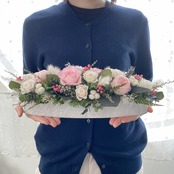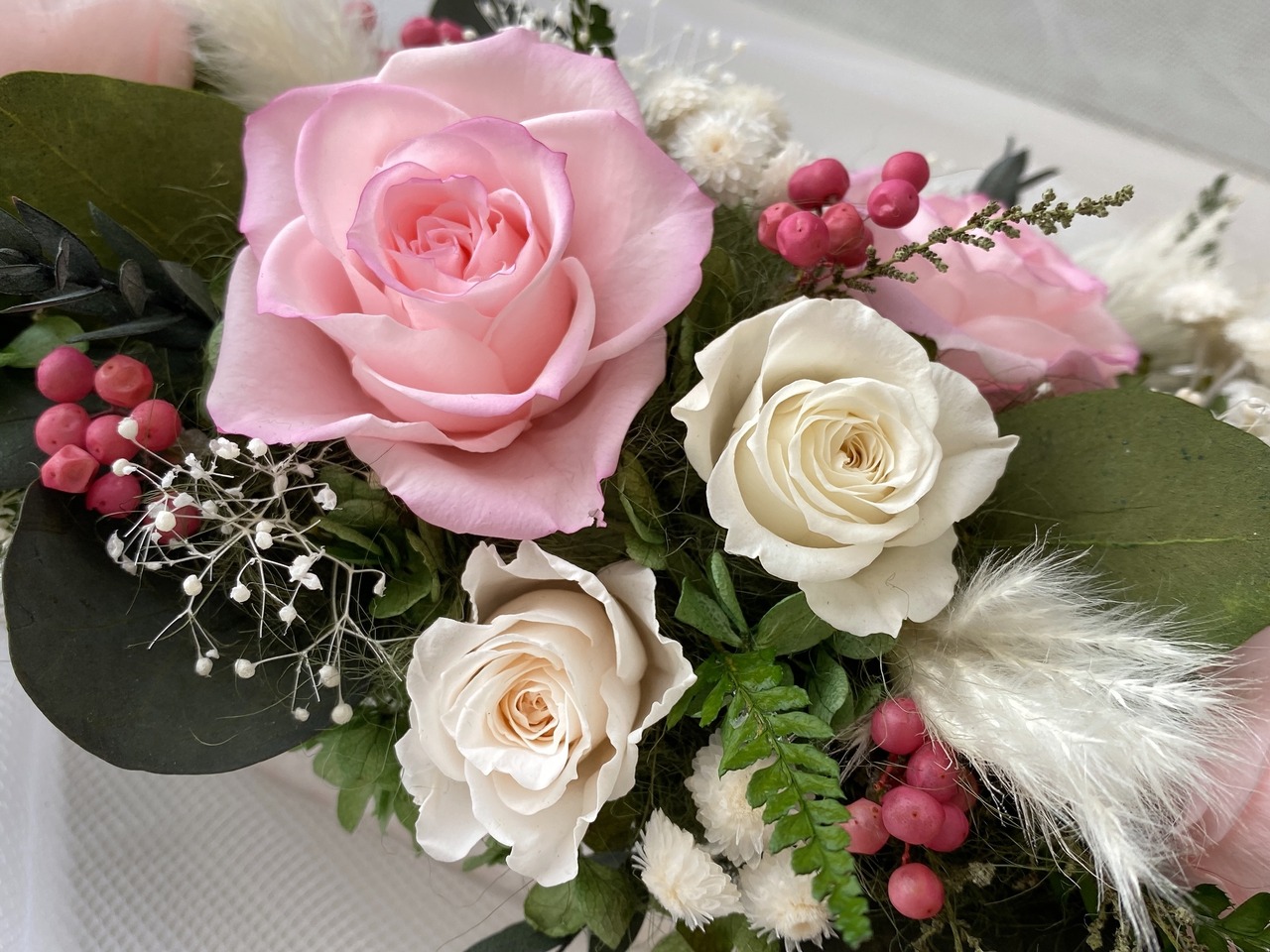 カップ咲きのローズをはじめ、沢山のバラとグリーンを施したアレンジです。どんな食事にも合うようにシンプルでエレガントに仕上げました。各種、贈り物にもお勧めです。※造花は一切使用せずオールプリザーブドで制作しております。商品サイズ 約H11.5×W37×D12cm花器サイズ H5×W30×D7cmケースサイズ H15×W40×D15cm