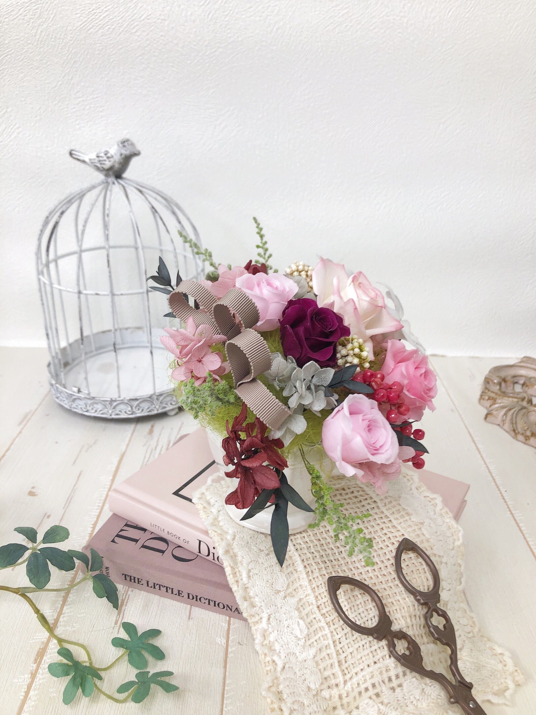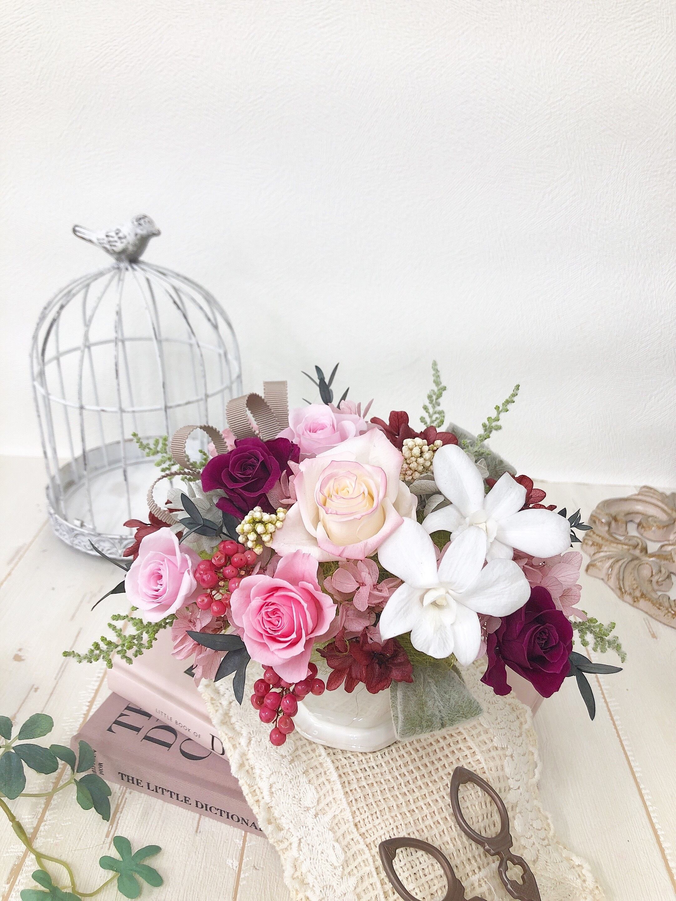 ピンクのふちどりの入った可愛らしいバラと、プリザーブドでは珍しいデンファレを使用し、ワイン色のカラーで大人っぽく上品に仕上げました。