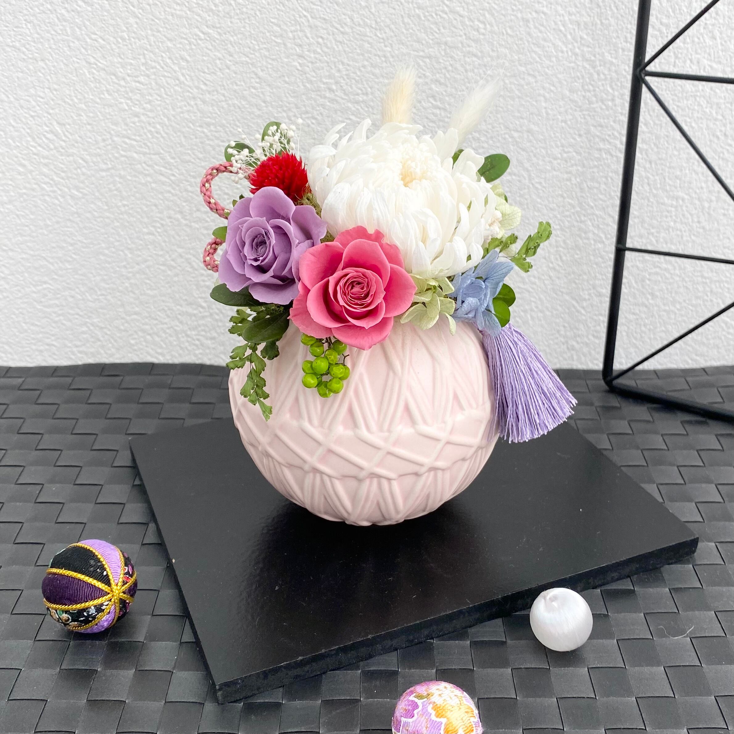 手まり型の陶器に沢山の花を盛り込み華やかで可愛く仕上げました。