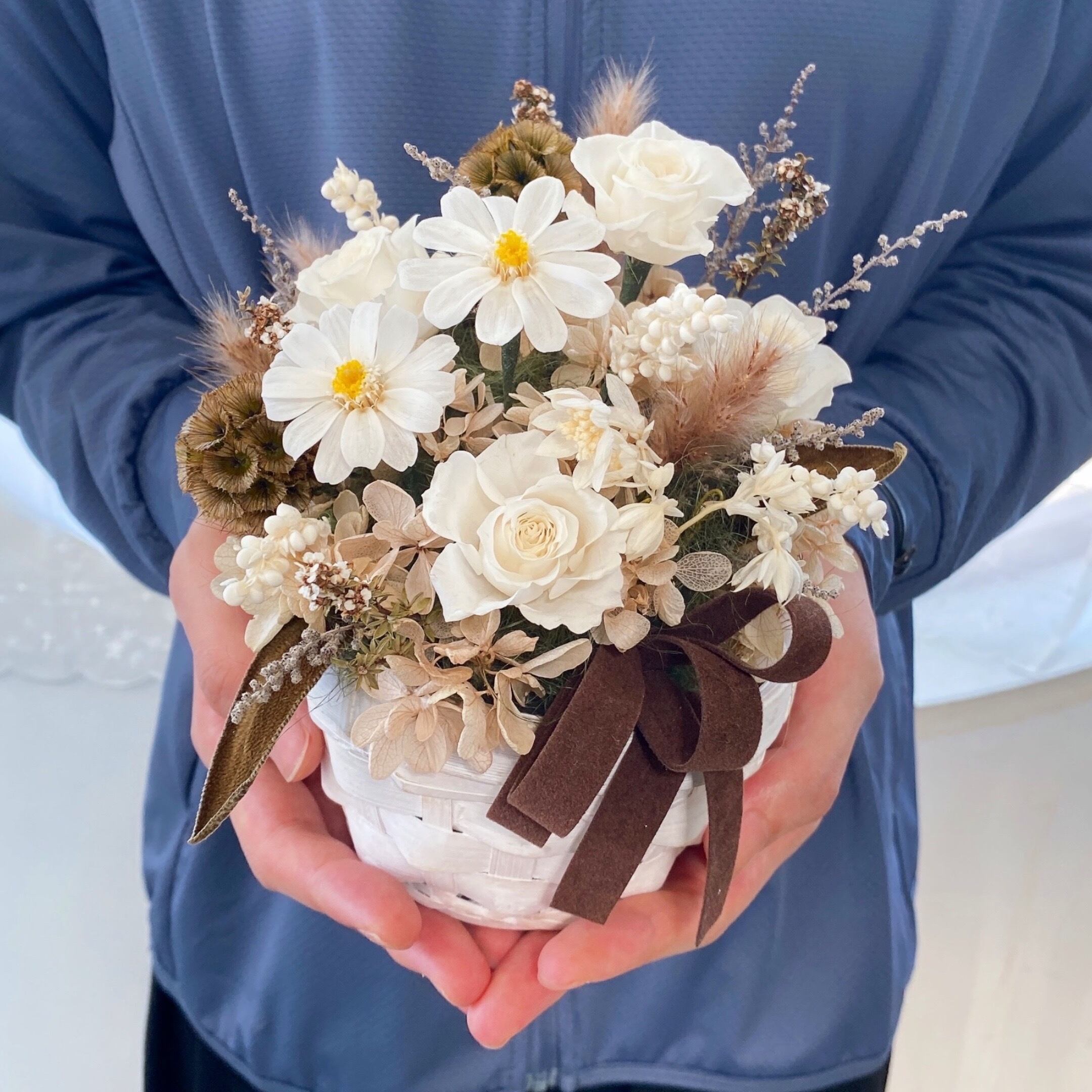 白のバラとジニア、茶系でまとめた花材とスエードの重ねリボンが大人かわいい暖かみのあるカゴアレンジです。