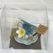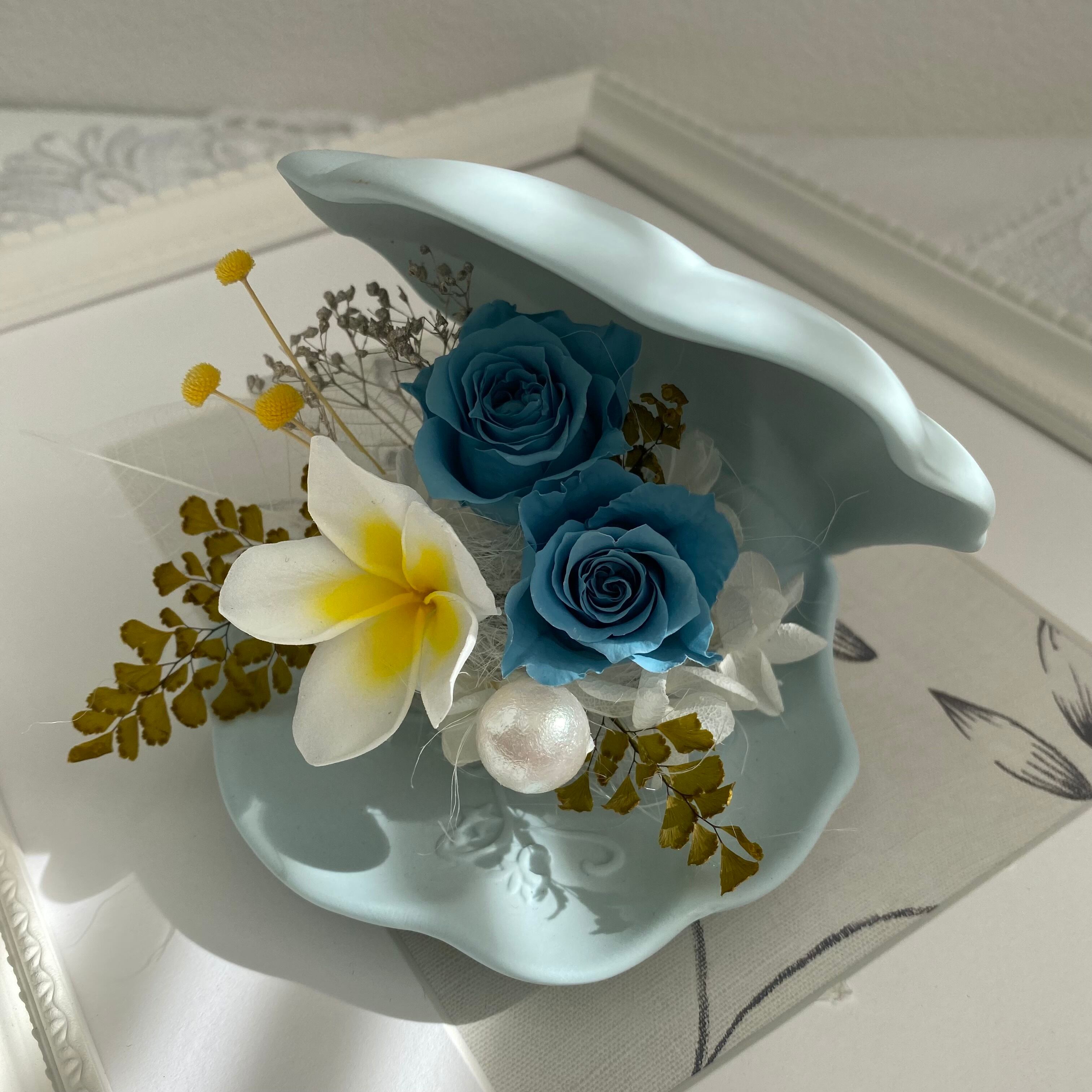 貝殻型の素焼きの陶器に希少花プリザーブドフラワープルメリアがメインの南国風アレンジです。珍しい贈り物をお探しの方にお勧めです。※造花は一切使用せず、オールプリザーブドで制作しております。