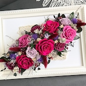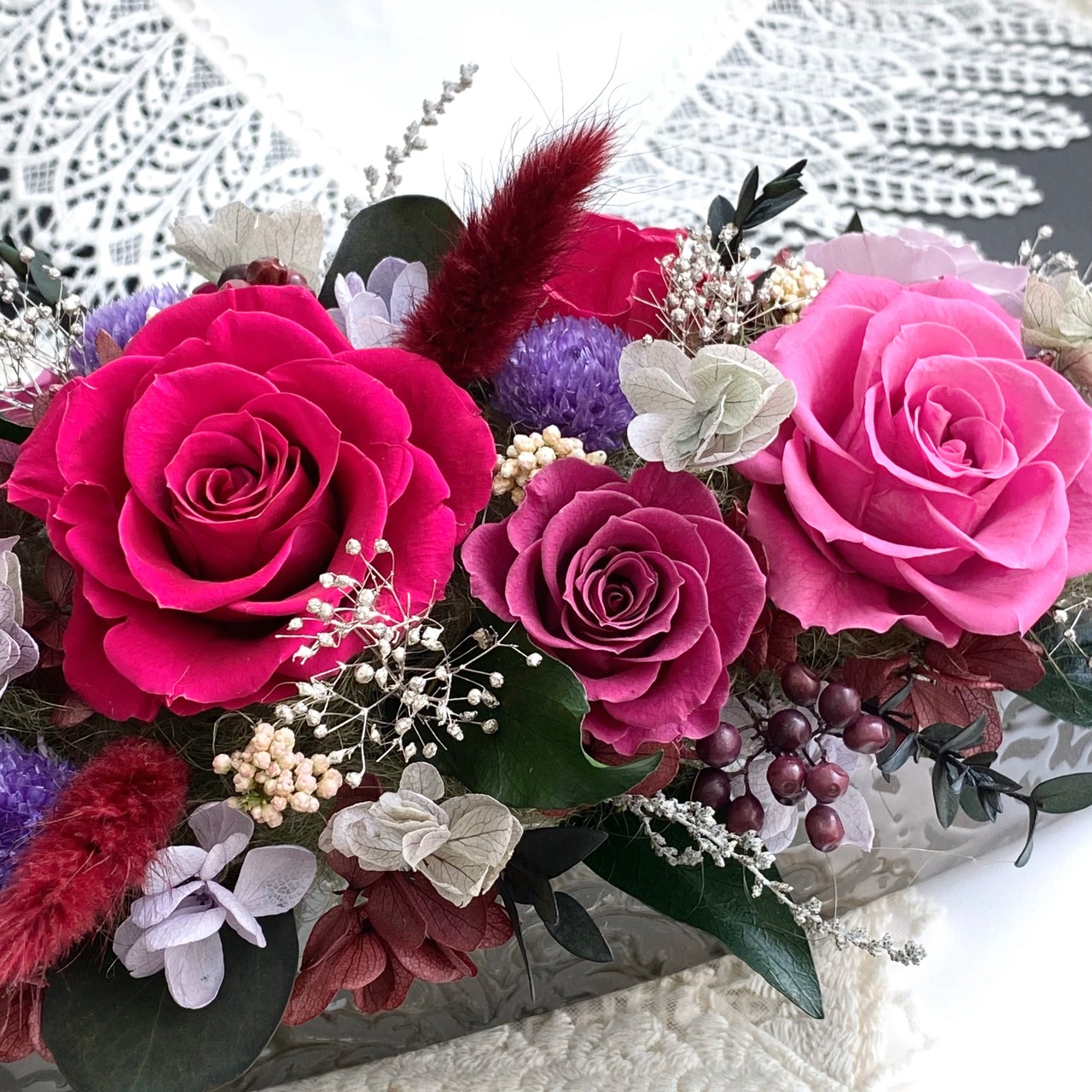 パープル系ローズと、たくさんの小花を使用したシルバーの器に映えるエレガントな雰囲気のアレンジです。※造花は一切使用せず、オールプリザーブドで制作しております。